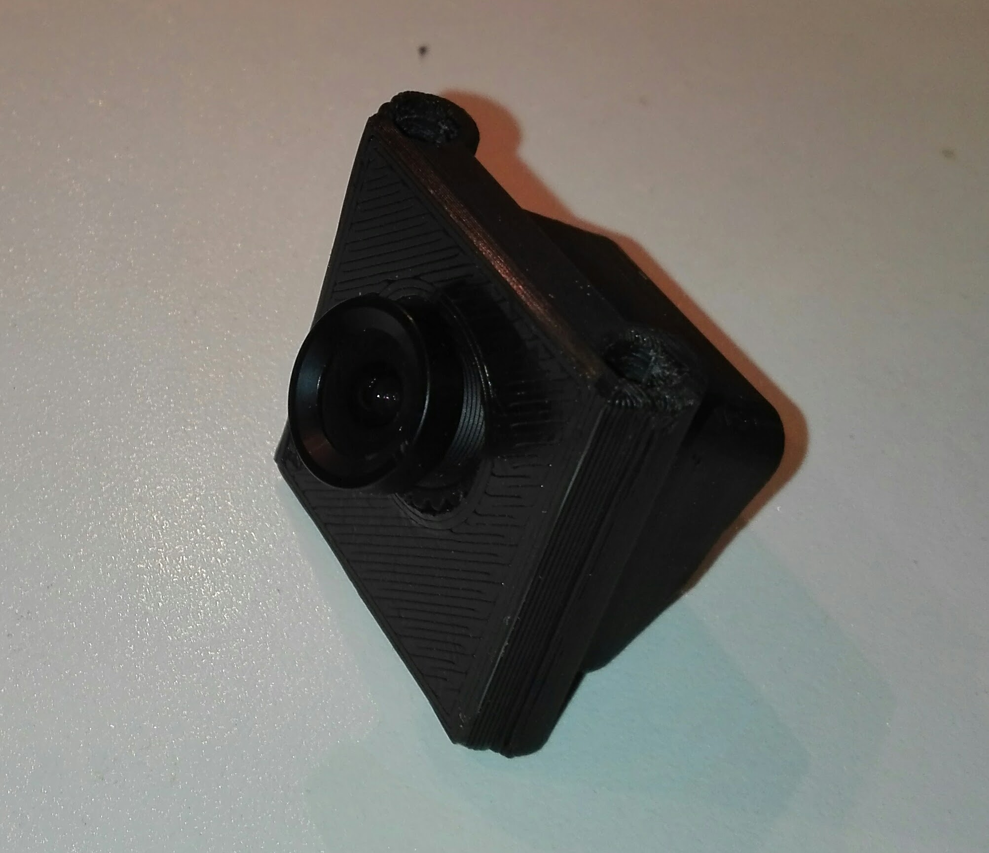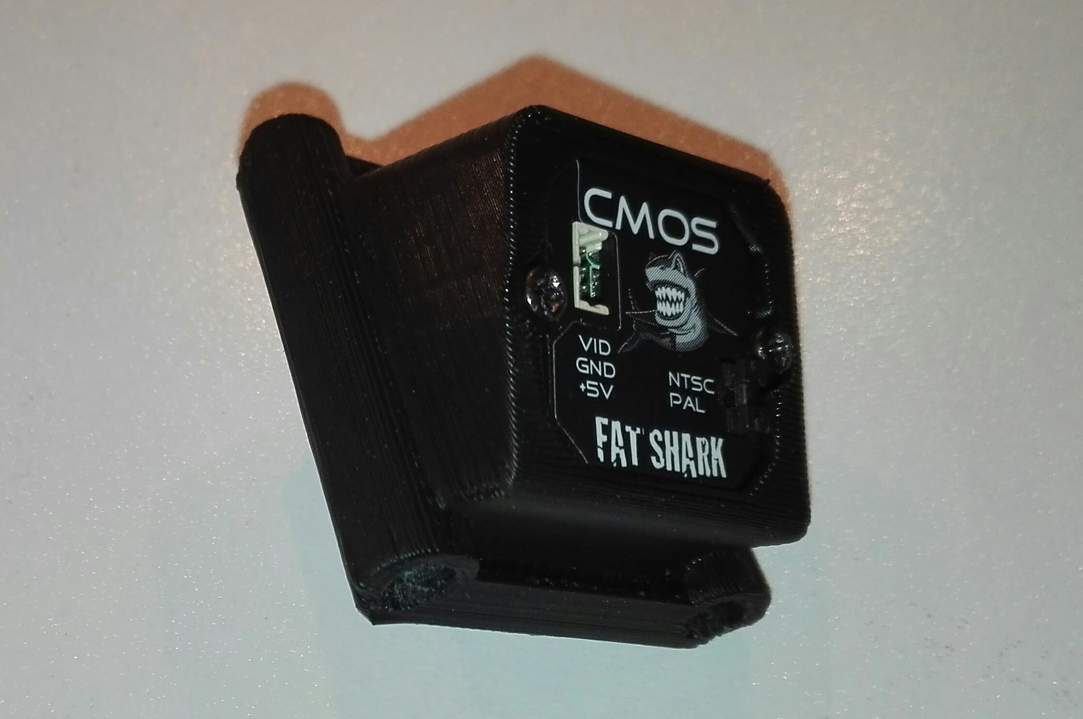 Voici un petit support de camera pour les dingo du FPV Racer. Ce support est dédié à la camera FatShark 600TVL. Ce support permet de bien aligner la Cam dans l’axe du drone et d’incliner cette dernière à 25°. Le support englobe entièrement la Cam et permet de la protéger en cas de gros crash.